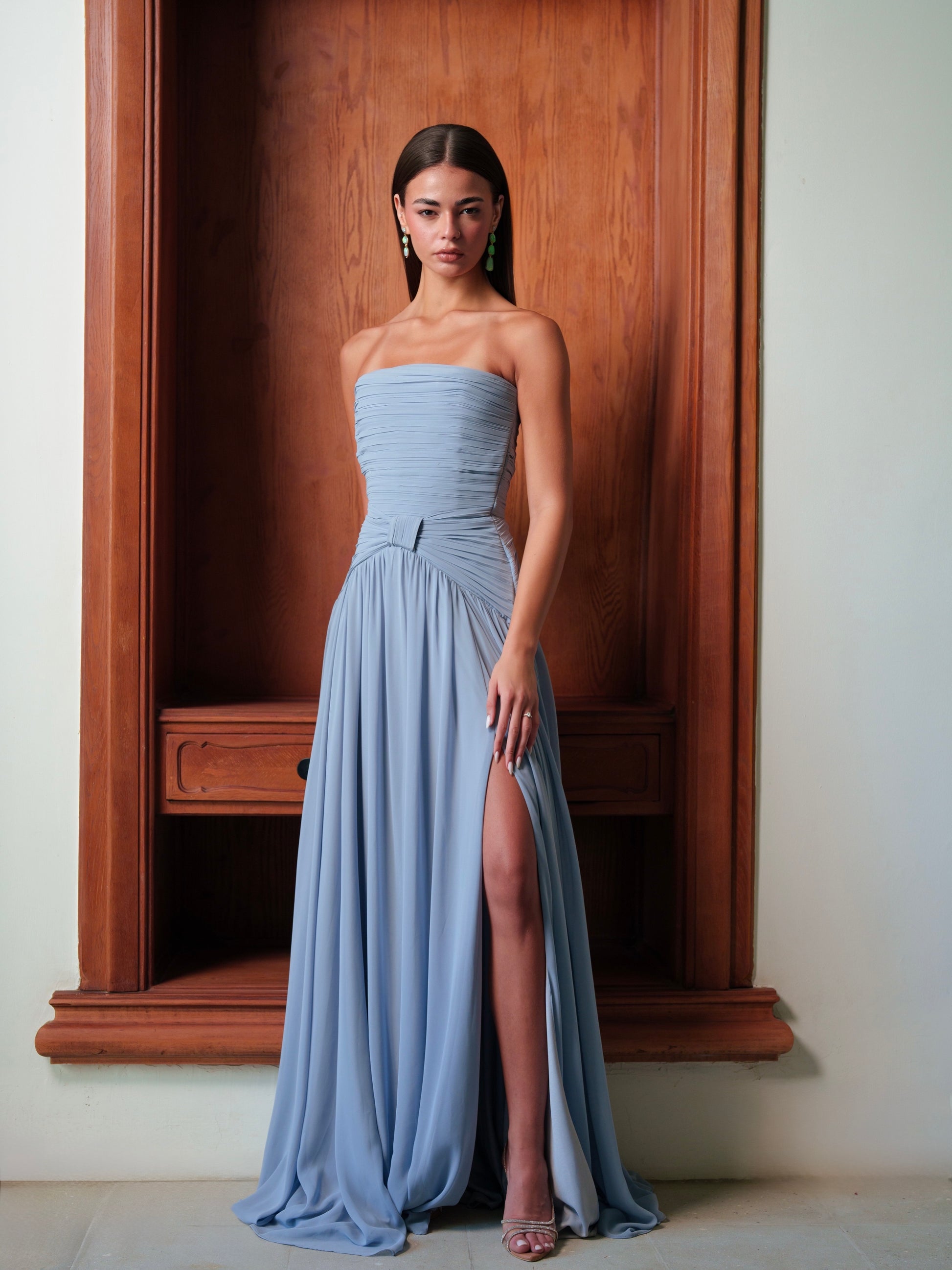 Baby blue flowy dress with a front slit